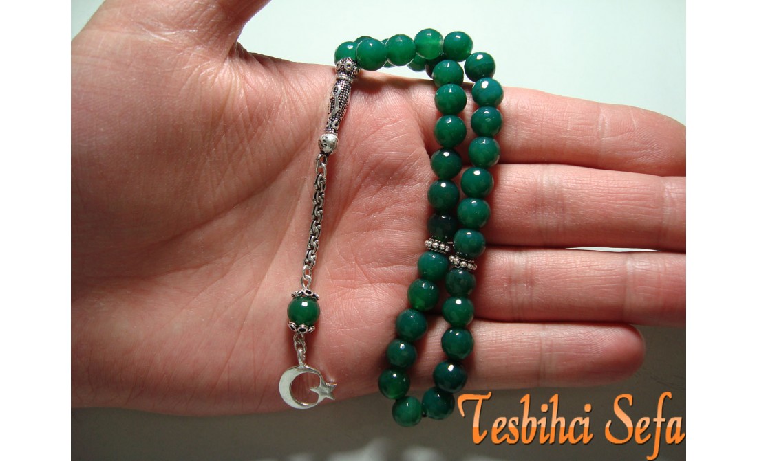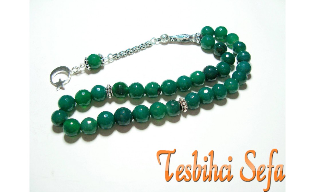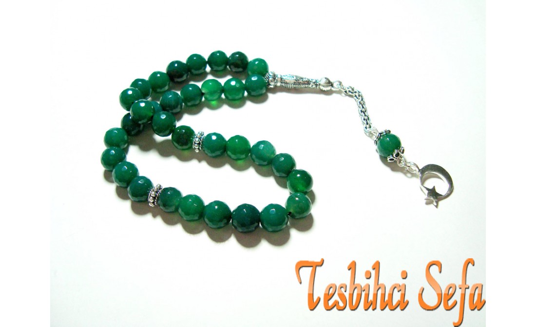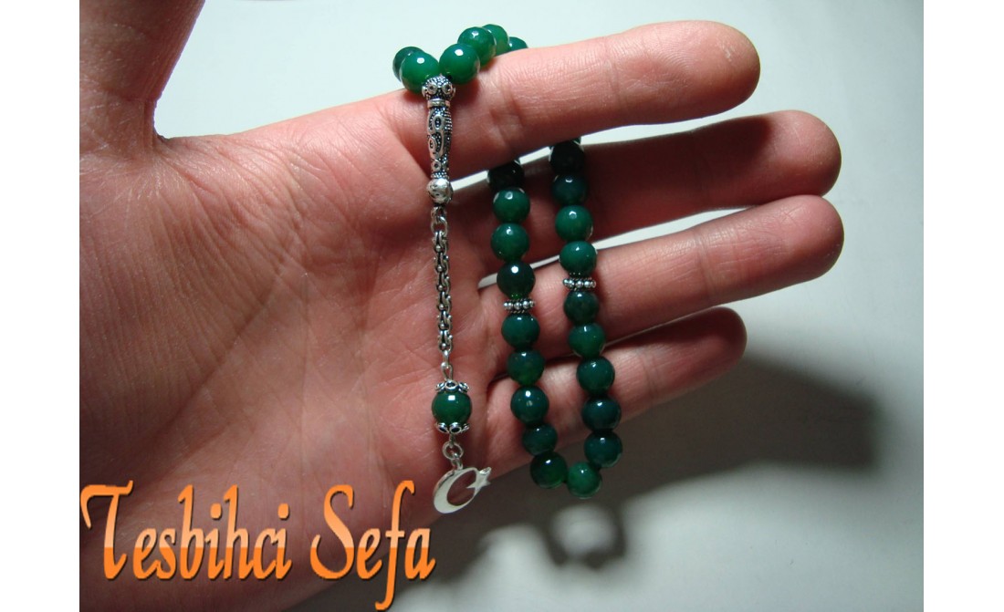 Şu anda incelemekte olduğunuz tesbih %100 gerçek yeşil akik taşları kullanılarak hazırlanmıştır...Tesbihde kullandığımız el yapımı olan arnavut püskül ve ayyıldızla kombine yapılmıştır...Tesbihin ara malzemeleri,imamesi ve püskülü tamamen 925.ayar saf gümüştür.Tesbih 8.mm boyutundadır günlük kullanım için gayet güzel ve kullanışlı bir tesbihdir... " Tesbihci Sefa " |