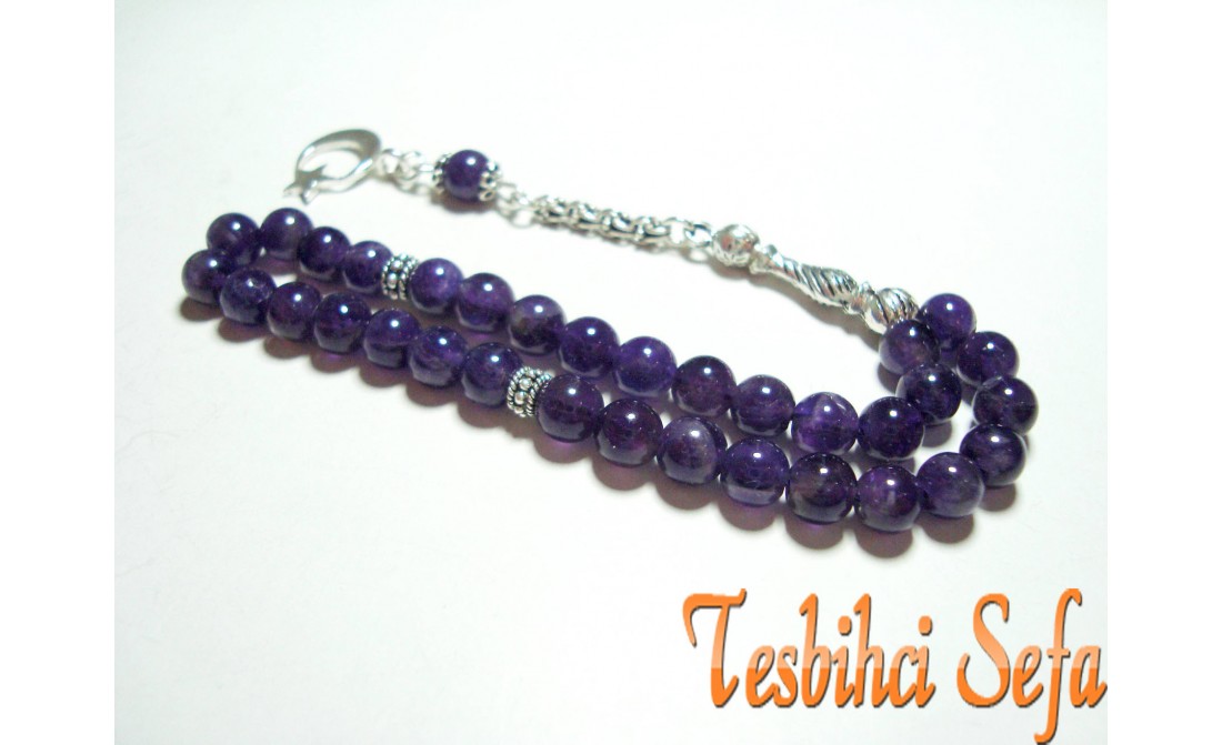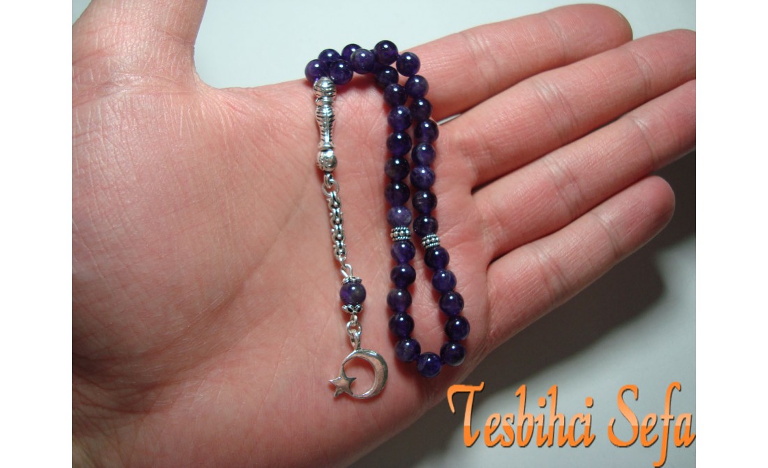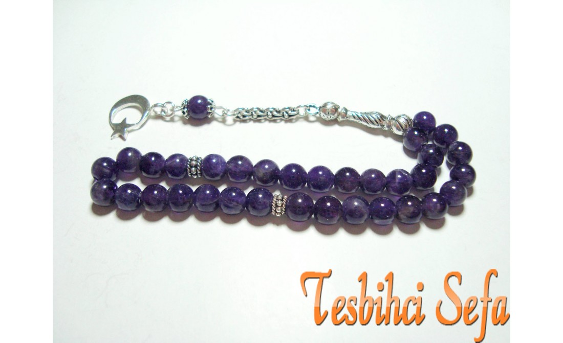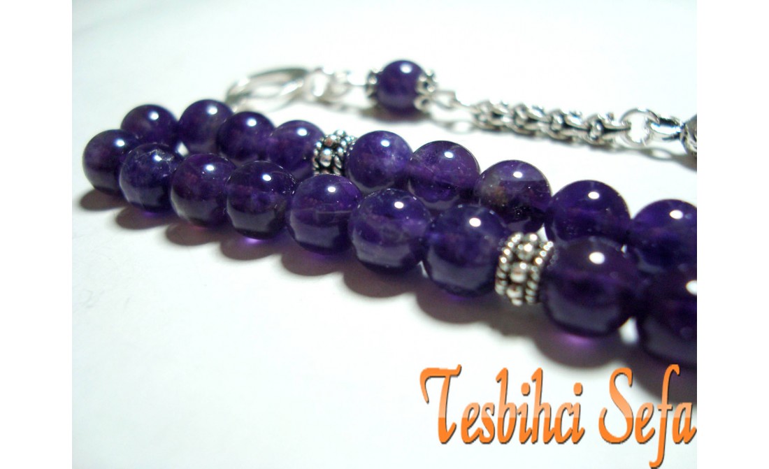 Şu anda incelemekte olduğunuz tesbih %100 gerçek ametist taşlar kullanılarak hazırlanmıştır...Tesbihde kullandığımız el yapımı olan arnavut püskül ve ayyıldızla kombine yapılmıştır...Tesbihin ara malzemeleri,imamesi ve püskülü tamamen 925.ayar saf gümüştür.Tesbih 6.mm boyutundadır günlük kullanım için gayet güzel ve kullanışlı bir tesbihdir... " Tesbihci Sefa " |