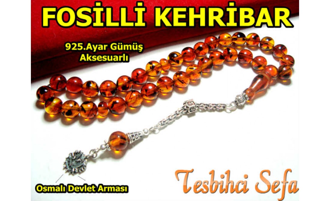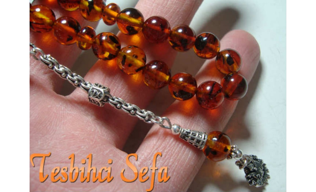 Tesbihimiz gerçek kehribarler yapılırken onlardan artan ramaklardan yanı tozlardan yapılmaktadır... İçerisinde gerçek fosiller bulunmaktadır.Bu fosiller kırıntı şeklinde tanelerin içerisine yayılmıştır... Tesbih 8.mm boyutunda günlük kullanım için en ideal boyuttadır... Tesbihde kullanılan tüm aksesuarlar komple 925.ayar saf gümüştür... " Tesbihci Sefa " |