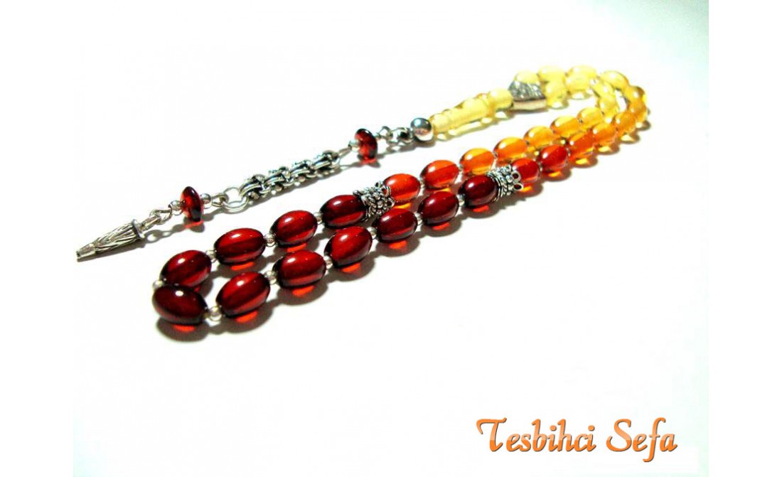 Tesbihde kullandığımız tüm aksesuarlar komple 925.ayar saf gümüştür. Birazcık Kehribar'dan Bahsedelim Kehribar,çoğumuzun aşina olduğu ağaç üzerindeki reçinenin fosilleşmiş halidir. Çoğunlukla kozalaklı ağaçların reçinesinden oluşmasının yanında tropikal çiçekli ağaçlarda da oluştuğu gözlemlenmektedir.Bu ağaç reçineleri kendilerini salgılayan ağaçla birlikte veya tek başına lagün,delta veya deniz ortamına taşınmaktadır.Milyonlarca sene boyunca bu ortama taşınmış,bazen yüzlerce metre kalınlığa ulaşmış tabakaların altında kalan reçine geçen bu zaman boyunca basınç ve sıcaklık etkenleriyle birlikte sertleşerek kehribara dönüşür. Kehribarın oluşum süresi basınç,sıcaklık ve geçen zamanla alakalıdır.Yeterli basınç ve sıcaklıkta bulunmayan reçine tam anlamıyla kehribar kıvamına gelemez,copal adı verilen tam olgunlaşmamış kehribar oluşur. " Tesbihci Sefa " |