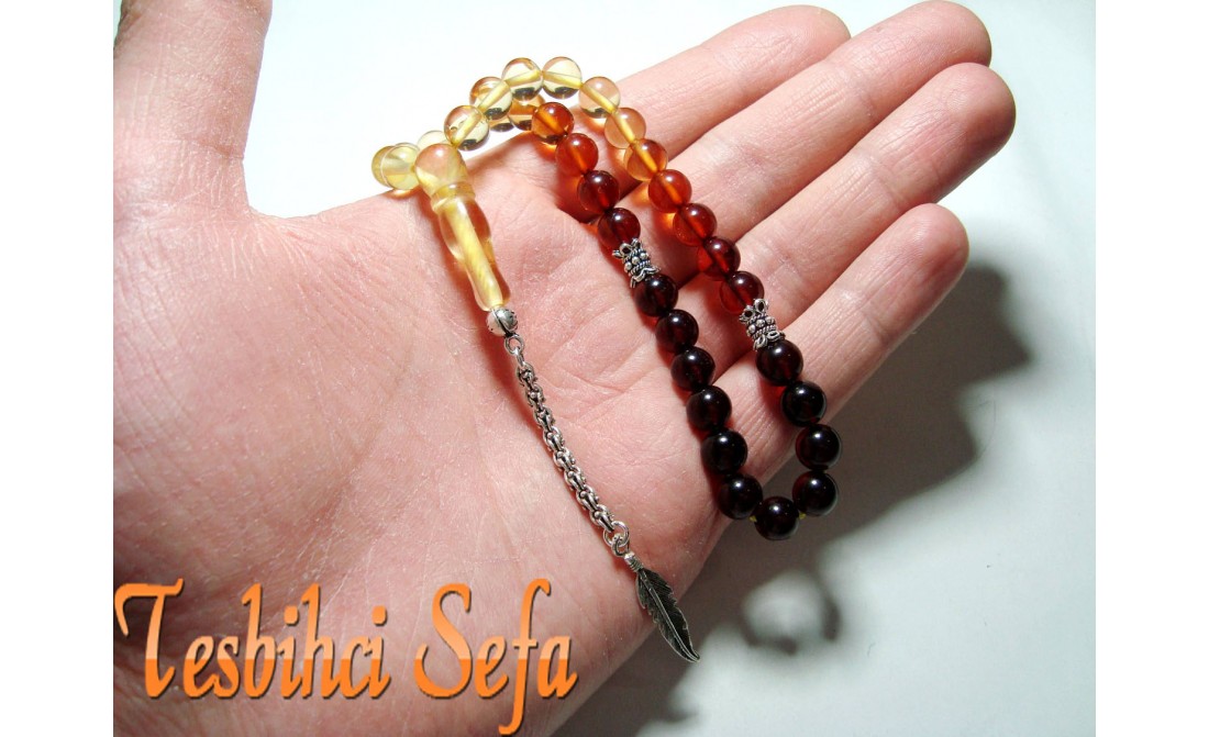 Tesbihde kullandığımız tüm aksesuarlar komple 925.ayar saf gümüştür. Birazcık Kehribar'dan Bahsedelim Kehribar,çoğumuzun aşina olduğu ağaç üzerindeki reçinenin fosilleşmiş halidir. Çoğunlukla kozalaklı ağaçların reçinesinden oluşmasının yanında tropikal çiçekli ağaçlarda da oluştuğu gözlemlenmektedir.Bu ağaç reçineleri kendilerini salgılayan ağaçla birlikte veya tek başına lagün,delta veya deniz ortamına taşınmaktadır.Milyonlarca sene boyunca bu ortama taşınmış,bazen yüzlerce metre kalınlığa ulaşmış tabakaların altında kalan reçine geçen bu zaman boyunca basınç ve sıcaklık etkenleriyle birlikte sertleşerek kehribara dönüşür. Kehribarın oluşum süresi basınç,sıcaklık ve geçen zamanla alakalıdır.Yeterli basınç ve sıcaklıkta bulunmayan reçine tam anlamıyla kehribar kıvamına gelemez,copal adı verilen tam olgunlaşmamış kehribar oluşur. " Tesbihci Sefa " |