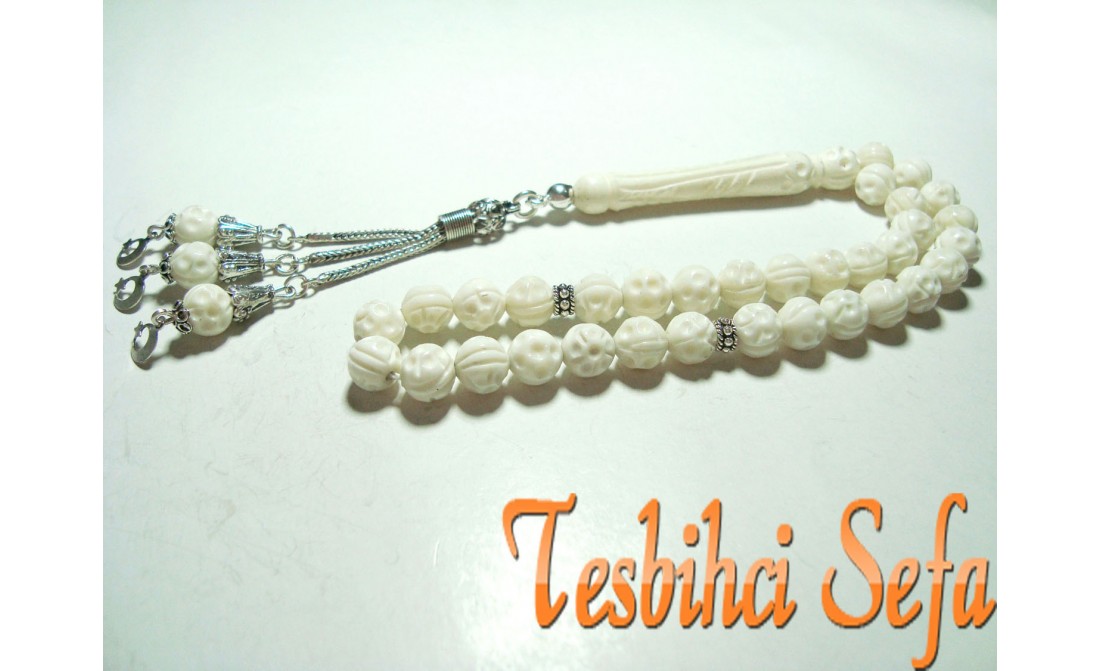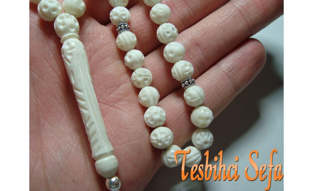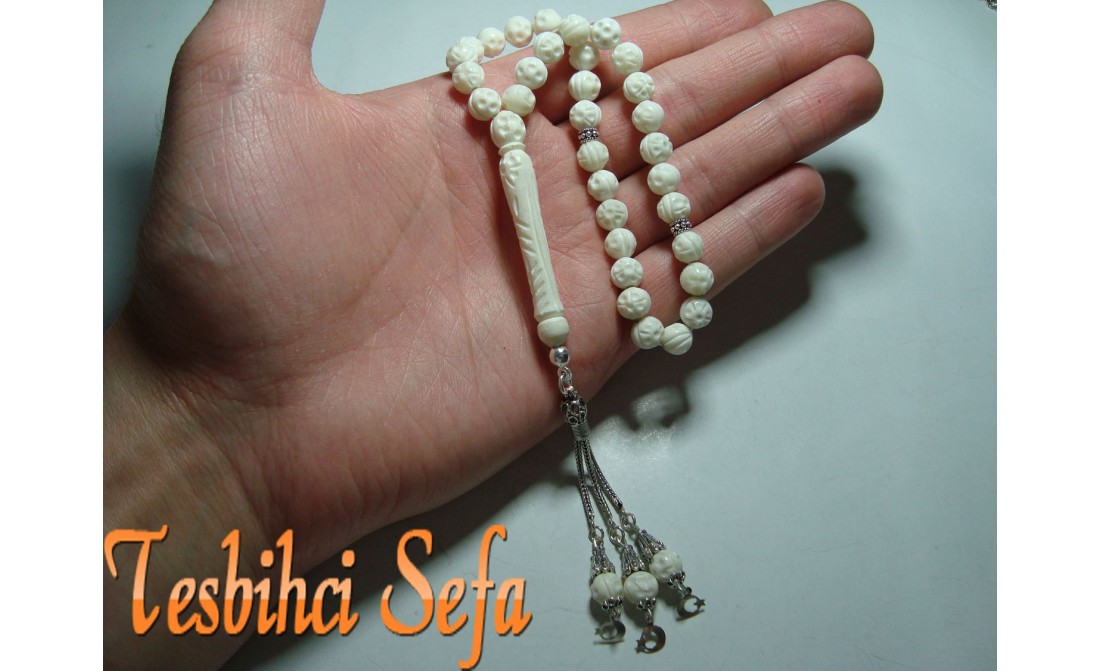 %100 Deve kemiğinden yapılmış harika bir kemik tesbih.Tesbih tamamen el yapımıdır.Tesbihde kullandığımız aparatlar komple 925.ayar saf gümüştür. " Tesbihci Sefa " |