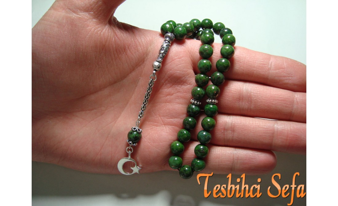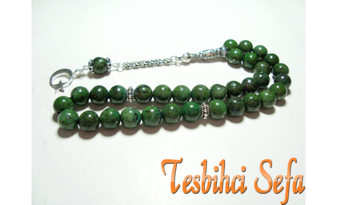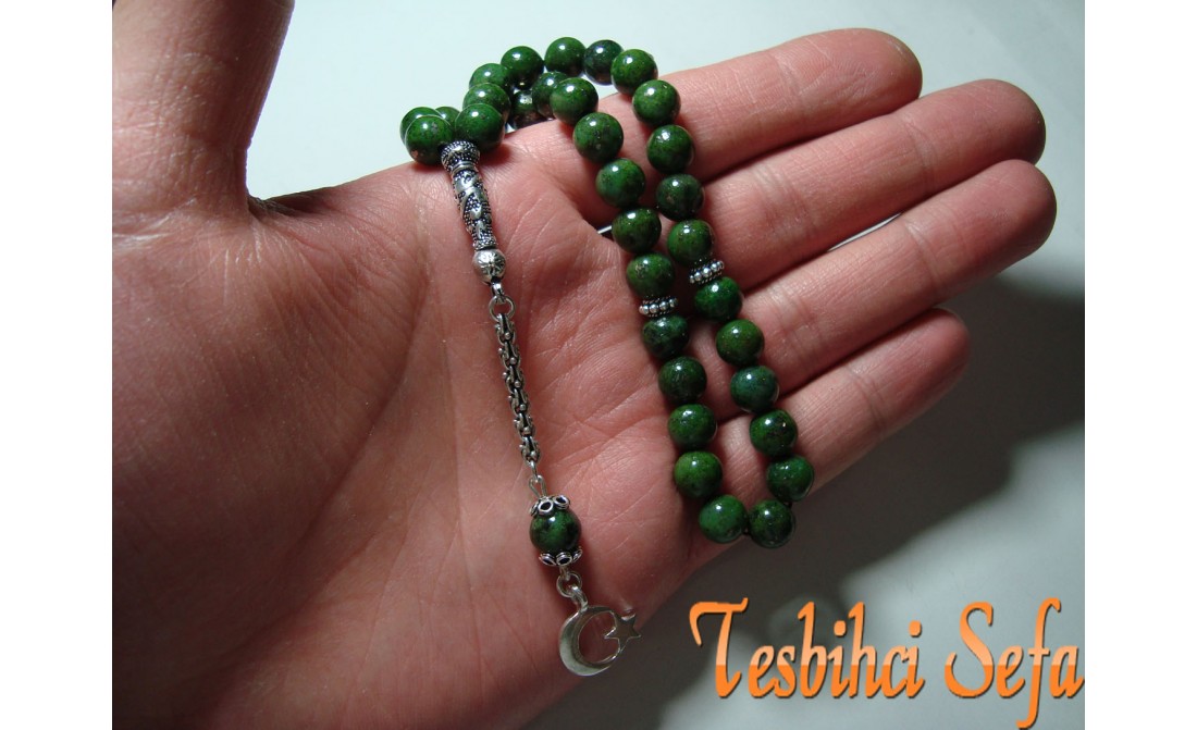 Şu anda incelemekte olduğunuz tesbih %100 gerçek malahit denilen doğal taşlar kullanılarak hazırlanmıştır...Tesbihde kullandığımız el yapımı olan arnavut püskül ve ayyıldızla kombine yapılmıştır...Tesbihin ara malzemeleri,imamesi ve püskülü tamamen 925.ayar saf gümüştür.Tesbih 8.mm boyutundadır günlük kullanım için gayet güzel ve kullanışlı bir tesbihdir... " Tesbihci Sefa " |