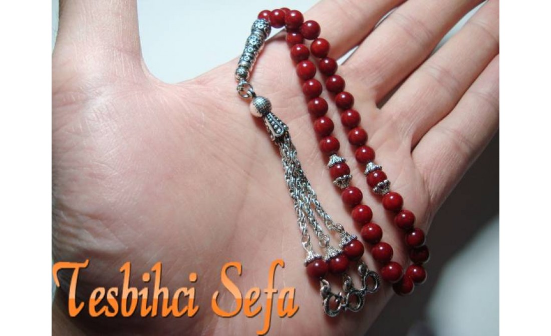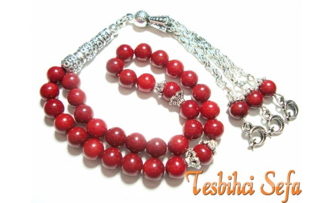 Şu anda incelemekte olduğunuz tesbih %100 doğal mercan taşlardan yapılmış olan çok güzel bir tesbihdir.Tesbihde kullanılan tüm aksesuarlar komple 925.ayar saf gümüş kaplama yapılmıştır.( Aksesuarlar gümüş değil , gümüş kaplamadır. ) " Tesbihci Sefa " |