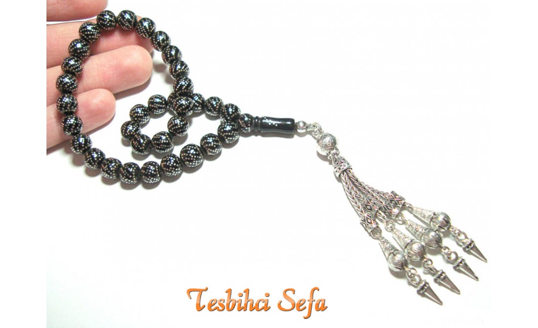 Tesbihin üzerinde yaklaşık olarak 8.500 adet gümüş nokta işlemesi vardır.Tesbihin püskülüde tamamen el yapımıdır.Resimlerde görüldüğü gibi emek ve işçilik ortada.Yapım aşaması yaklaşık olarak beş gün sürüyor. " Tesbihci Sefa " |